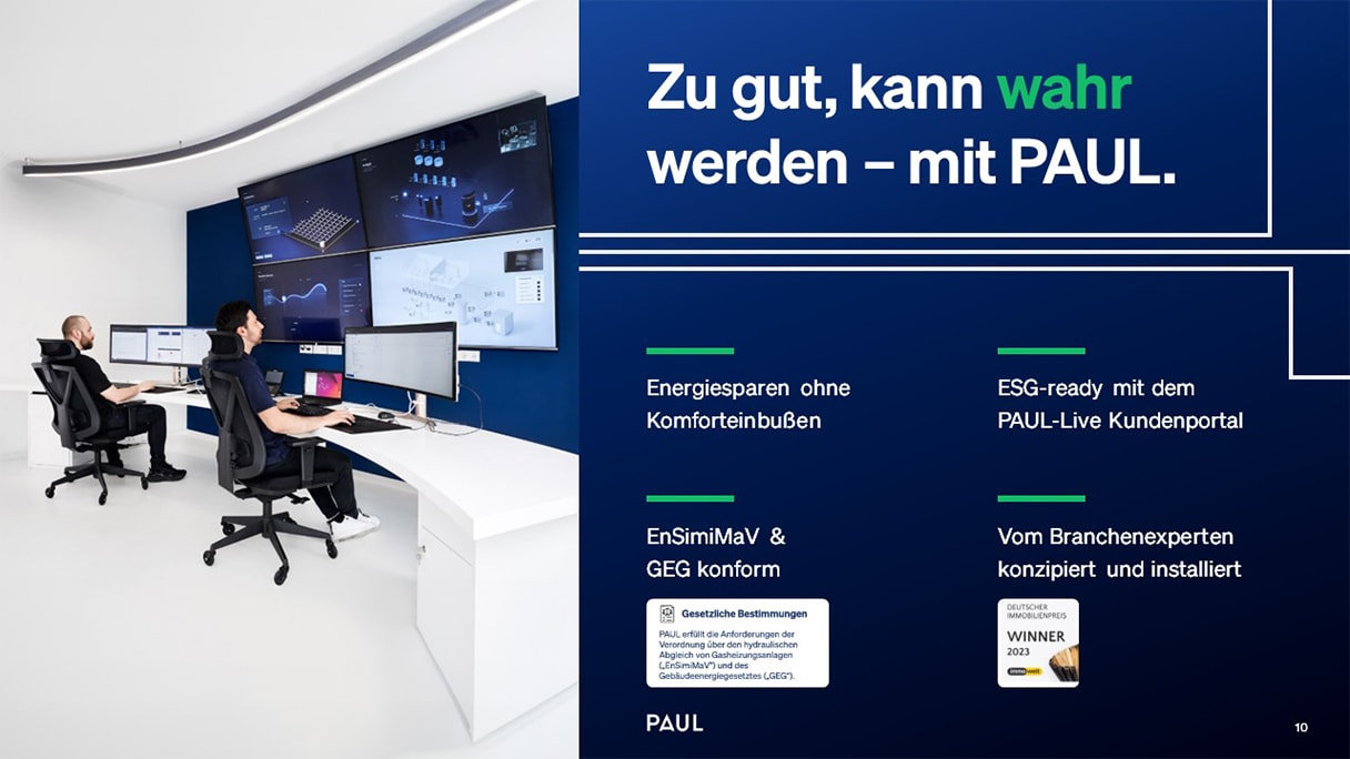 Für die innovative PAUL Tech AG, die die CO2-Emissionen von Gebäuden minimiert und durch AI-gesteuertes Heizen Immobilienwerte steigert, erstellten wir die Showpräsentation für einen 15 Minuten-Pitch.