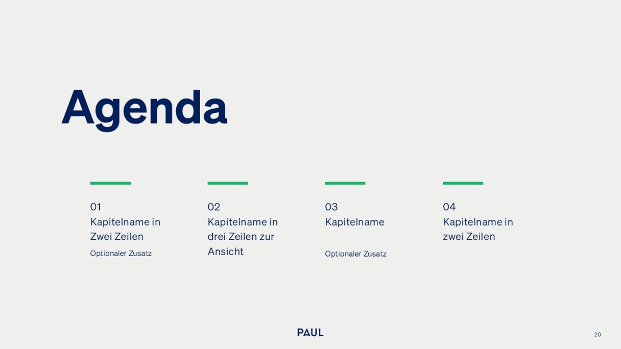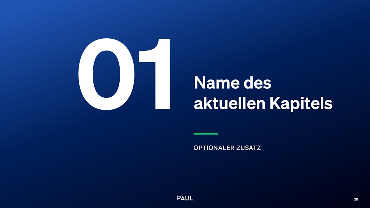 Dafür erarbeiteten wir in einem Workshop mit dem PAUL-Team auf Basis ihres Markenkerns das Ziel der Präsentation: PAUL soll digital, glaubwürdig und empathisch erscheinen. In der Konzeptionsphase traf AI auf AI: Für ihre AI-Lösungen recherchierten und entwickelten wir mit AI eine individuelle Bildsprache sowie ein passendes Wording. Mit auf den Punkt gebrachten Botschaften und zwei zielgruppenorientierten Erzählsträngen formulierten wir eine Storyline für Assetmanager und Wohnbaugenossenschaften. In der Pitch-Präsentation bringen wir hochkomplexe technische Vorgänge in eine einfache, verständliche Visualität und Sprache.