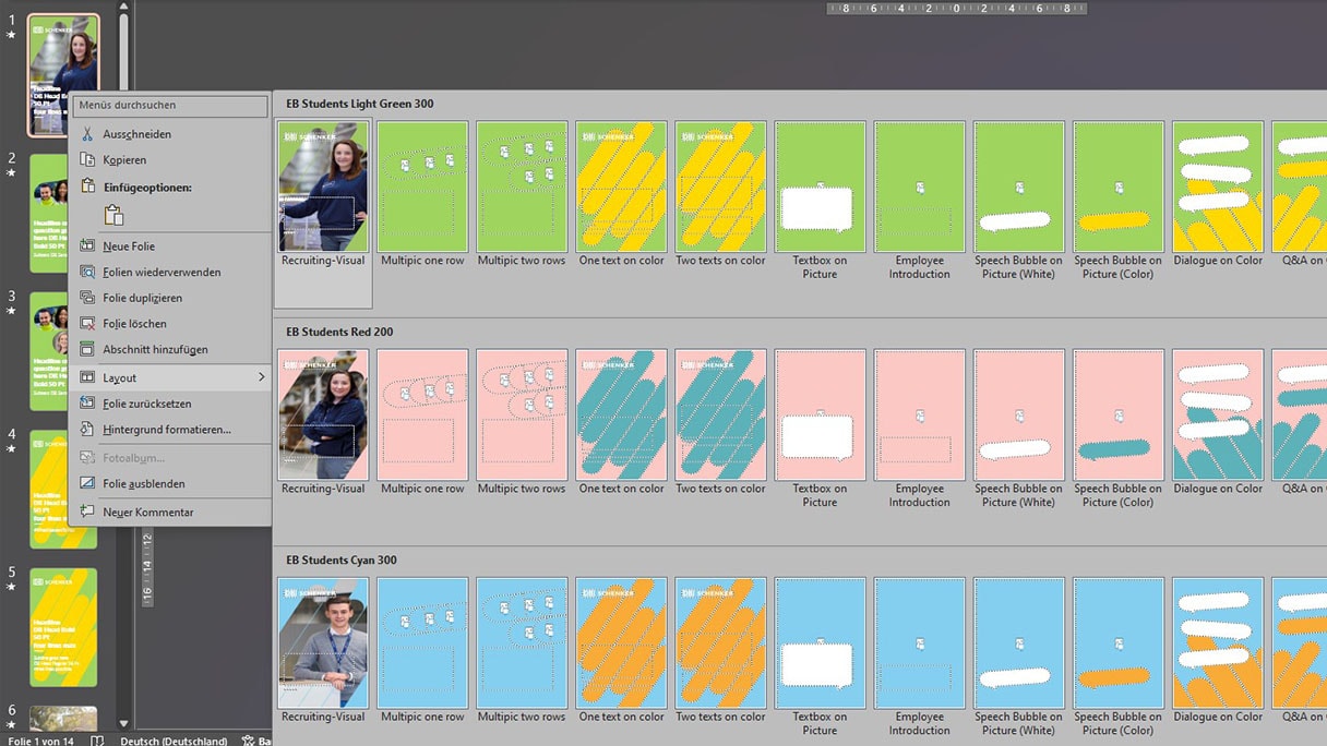 Im Rahmen eines neuen Employer Brandings hat sich DB Schenker als Arbeitgebermarke neu und charakteristisch in den sozialen Medien positioniert. Dabei sollen diverse Zielgruppen wie Student:innen, Akademiker:innen und Professionals angesprochen werden. Das Mittel der Wahl: PowerPoint Templates für Postings in sozialen Medien. Sie sind einfach zu bearbeiten und international einsetzbar - perfekt für einen global einheitlichen Auftritt. Das Ergebnis ist eine Auswahl an gestalteten und animierten Layouts zur Erstellung individueller Video- und Bildinhalte für Facebook, Instagram, LinkedIn und X (vorher Twitter).