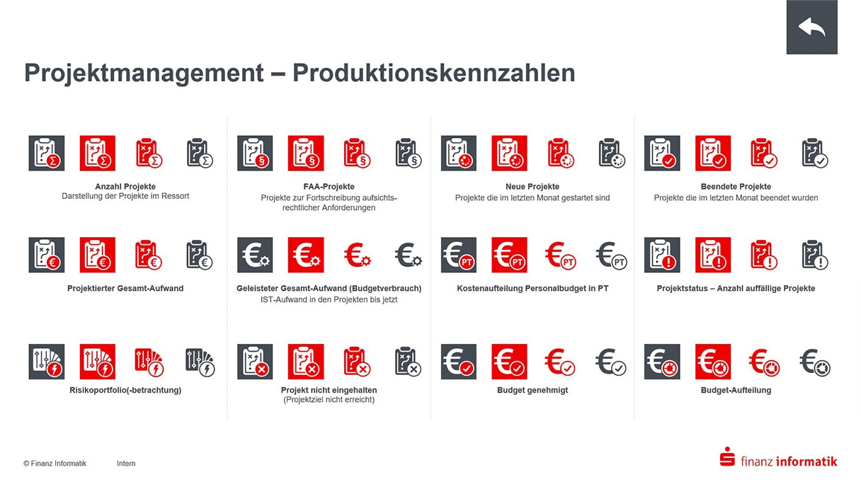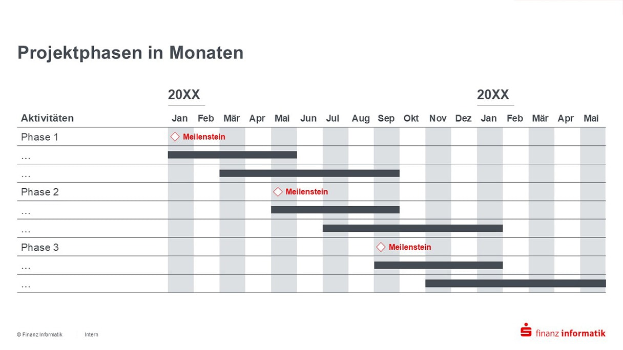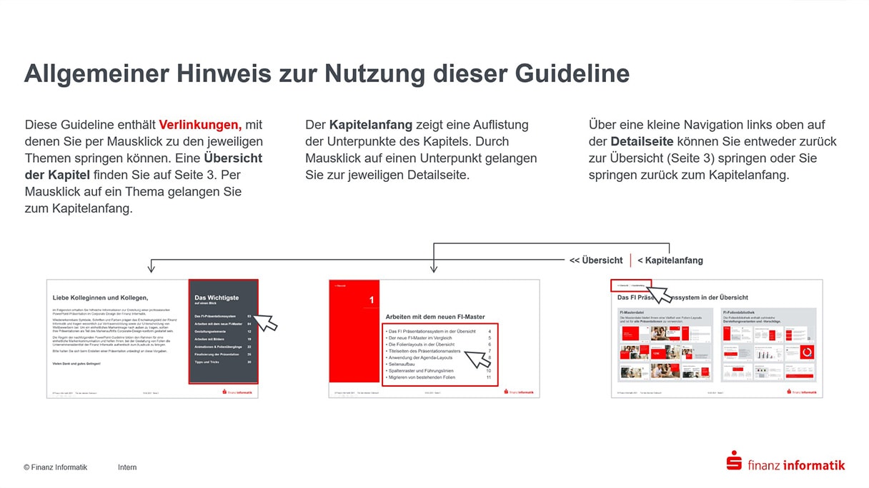 Da die Finanz Informatik zuvor ein Rebranding vollzogen hatte, war der Zeitpunkt für einheitliche Präsentationsvorlagen günstig. Und notwendig. Denn die neue CI will Farbe bekennen: weg vom technischen Blau hin zum emotionalen Rot der Sparkassenwelt.