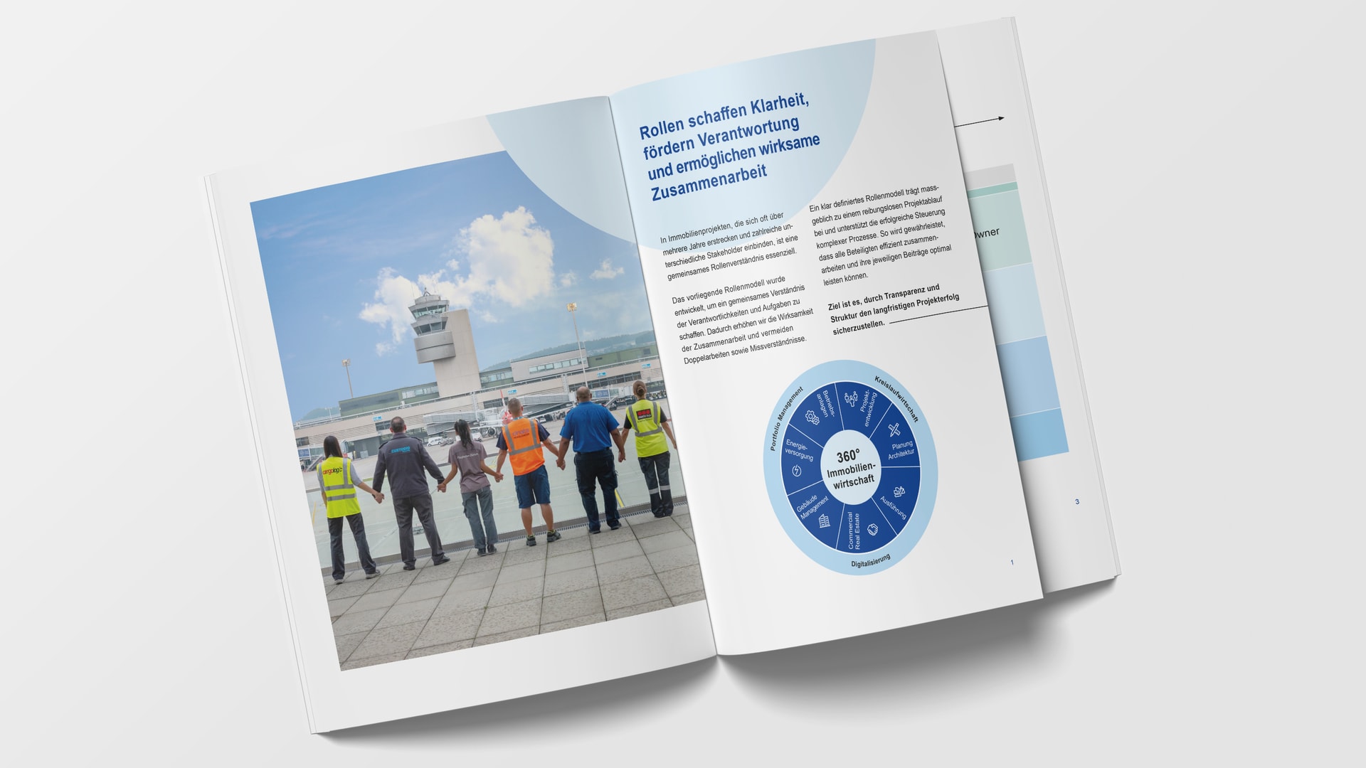 In komplexen Immobilienprojekten mit vielen Beteiligten ist ein gemeinsames Rollenverständnis entscheidend. Für die Flughafen Zürich AG entwickelte K16 eine Broschüre, die genau das schafft: Klarheit über Aufgaben, Zuständigkeiten und Projektphasen – visuell strukturiert und farblich codiert.