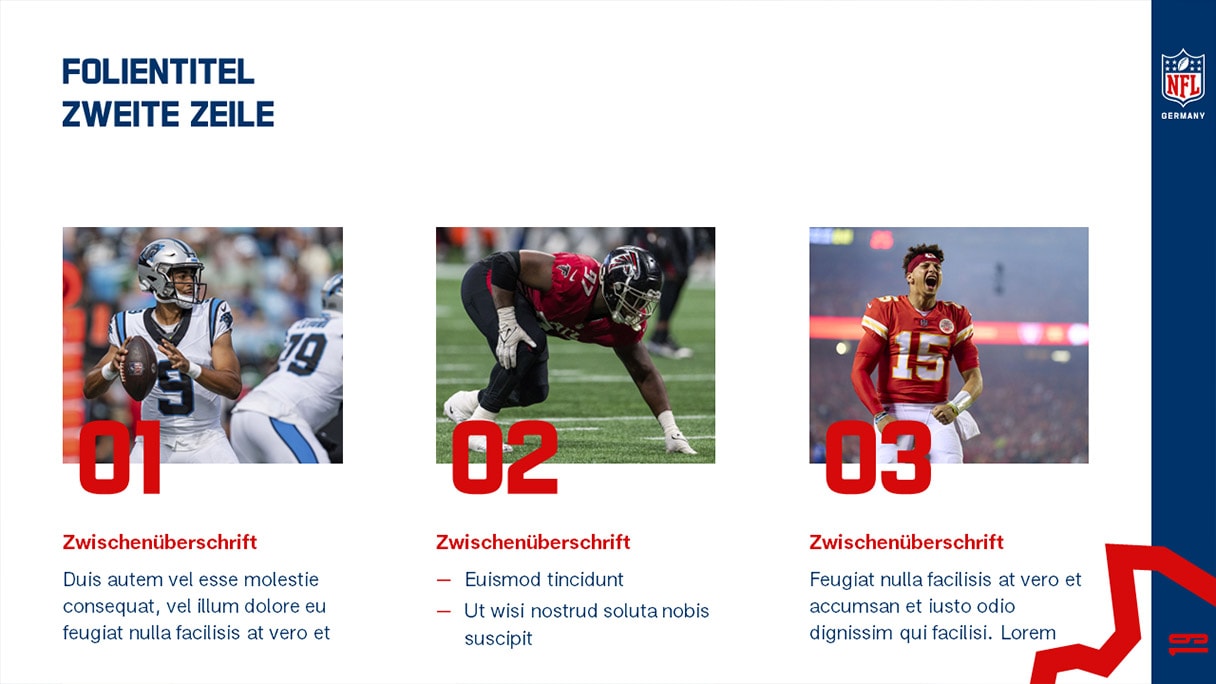Neu aufgestellt im PowerPoint-Game für die Kommunikations-Offensive: Für die NFL Deutschland haben wir eine benutzerfreundliche und brand-konforme PowerPoint-Vorlage entwickelt. Dafür haben wir die vielfältigen Gestaltungsvarianten im Corporate Design Manual in die speziellen Anforderungen einer PowerPoint-Präsentation übersetzt und vereinfacht für die Nutzerfreundlichkeit. So entstand ein Präsentationsmaster, dessen starker, konsistenter Look sowohl die Tradition als auch die Dynamik der NFL widerspiegelt und zugleich von allen Mitarbeitenden auch ohne Designkenntnisse genutzt werden kann.