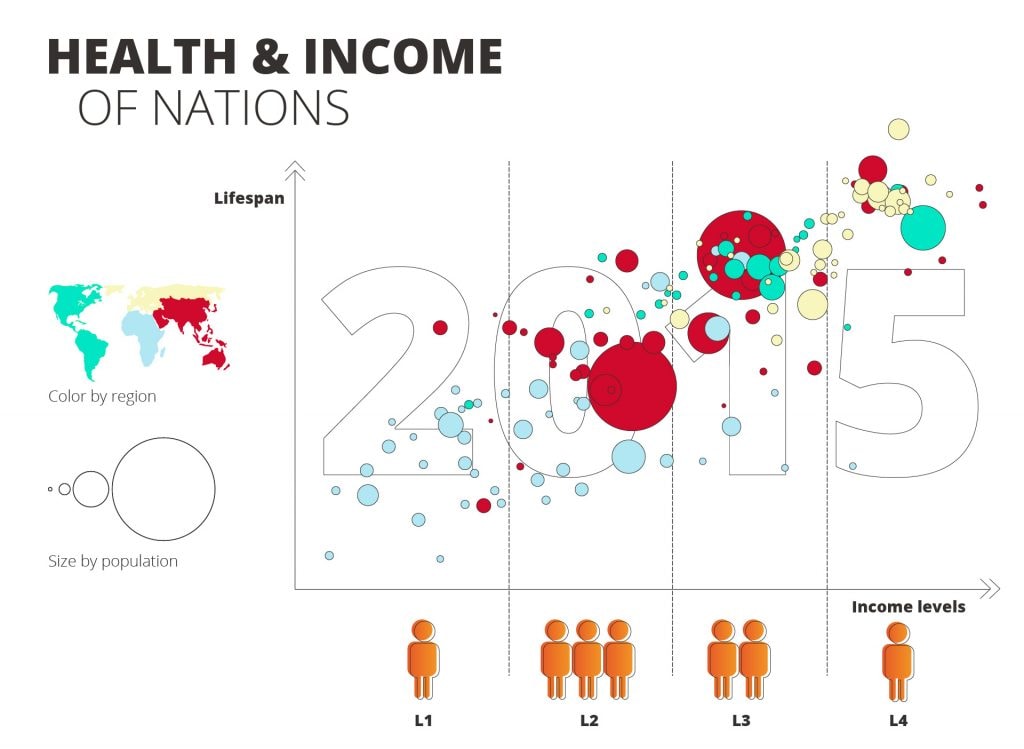 Die Kernbotschaft von Hans Rosling ist, dass die meisten Menschen in einer verzerrten Wahrnehmung der Welt leben, die unser Denken und Handeln seiner Meinung nach deutlich negativ beeinflusst. Dies beobachtete er etwa in der Arbeit mit seinen Studenten – eigentlich einer wie man meinen sollte, sehr gebildeten Gruppe – die ein deutlich negativeres Bild vom Fortschritt in der Welt haben, als es eigentlich der Realität entspricht. Diese verzerrte Wahrnehmung liegt nicht an der Verfügbarkeit und Zugänglichkeit von Daten, sondern er an einer irreführenden Intuition, die in unseren Instinkten angelegt scheint – und an der verfügbaren Übersicht von Daten. Mit seinem Institut Gapminder machte er sich deshalb zur Aufgabe, Daten auf einer höheren Ebene zu verdichten und so den größeren Zusammenhang der Dinge zu beleuchten. Die Grafik unten zeigt beispielsweise, eine Zusammenschau von Daten aus verschiedenen Quellen über die Verteilung von Einkommen und Gesundheit in der Welt. Das Bild zeigt entgegen der Intuition nicht die einfache Verteilung in Arm und Reich. Vielmehr wird sichtbar, dass das echte Bild wesentlich differenzierter und keineswegs schwarz und weiß ist. Die Zeitreihenbetrachtung wiederum zeigt – ebenfalls entgegen der ersten Intuition – das in den letzten 30 bis 40 Jahren eine beachtliche Entwicklung stattgefunden hat. Dasselbe gilt für zahlreiche andere Beispiele: Kindersterblichkeit, Ernährungssituation, sogar die Anzahl der Todesopfer von Umweltkatastrophen. Alle diese Daten haben sich positiv entwickelt – oft entgegen unserer allgemeinen Intuition. Gleichzeitig ist unbestritten, dass die Erwärmung des Planeten zunimmt, genauso wie die absolute Anzahl der Umweltkatastrophen. Es ist eben beides wahr. Oder wie Hans Rosling es beschreibt: „Dinge können gleichzeitig schlecht sein und besser werden.“