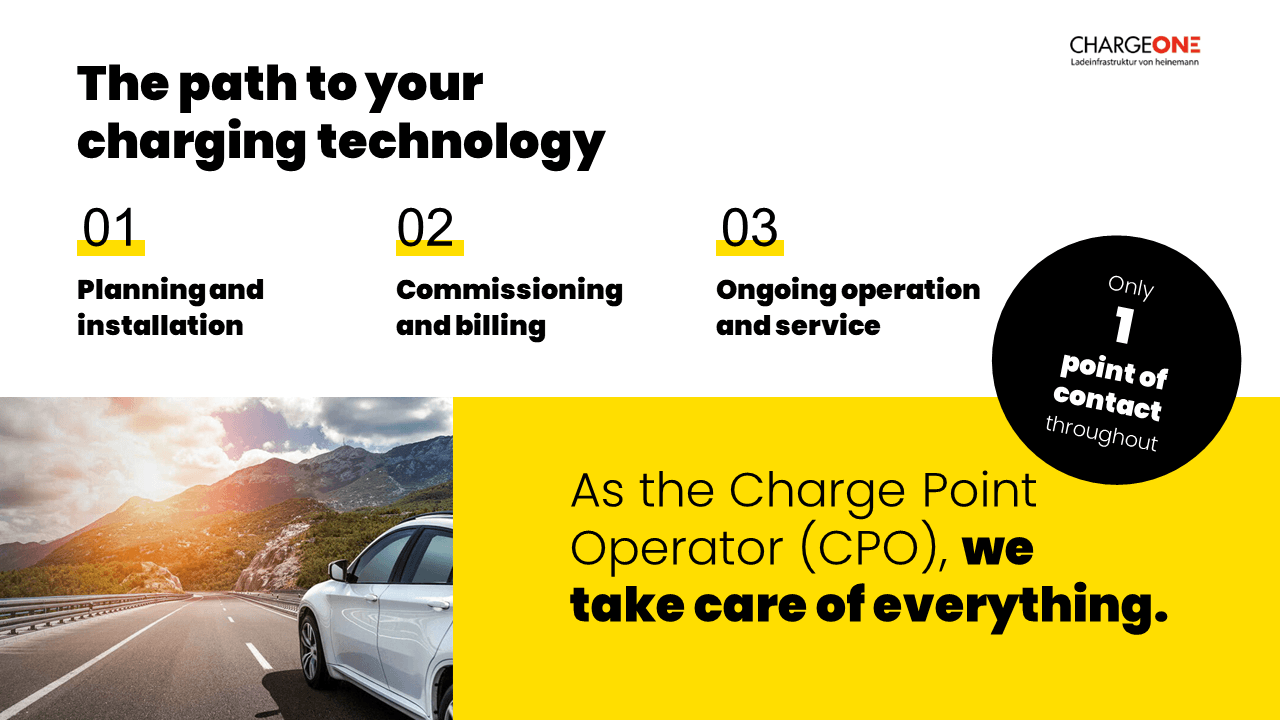 We designed a new corporate presentation for ChargeOne, the Heinemann Group's e-mobility brand, both visually and in terms of content. The basis for this was an offer presentation we created, the design of which was so well received that we were asked to implement the entire corporate presentation in the same look and feel. To highlight ChargeOne's visual identity, we used yellow bars and highlights. The animation concept underscores the company's dynamism. For the storyline of the company presentation, we further developed the existing story and researched new key facts. In line with the storyline, we created narration texts that every ChargeOne employee can use to present the company.